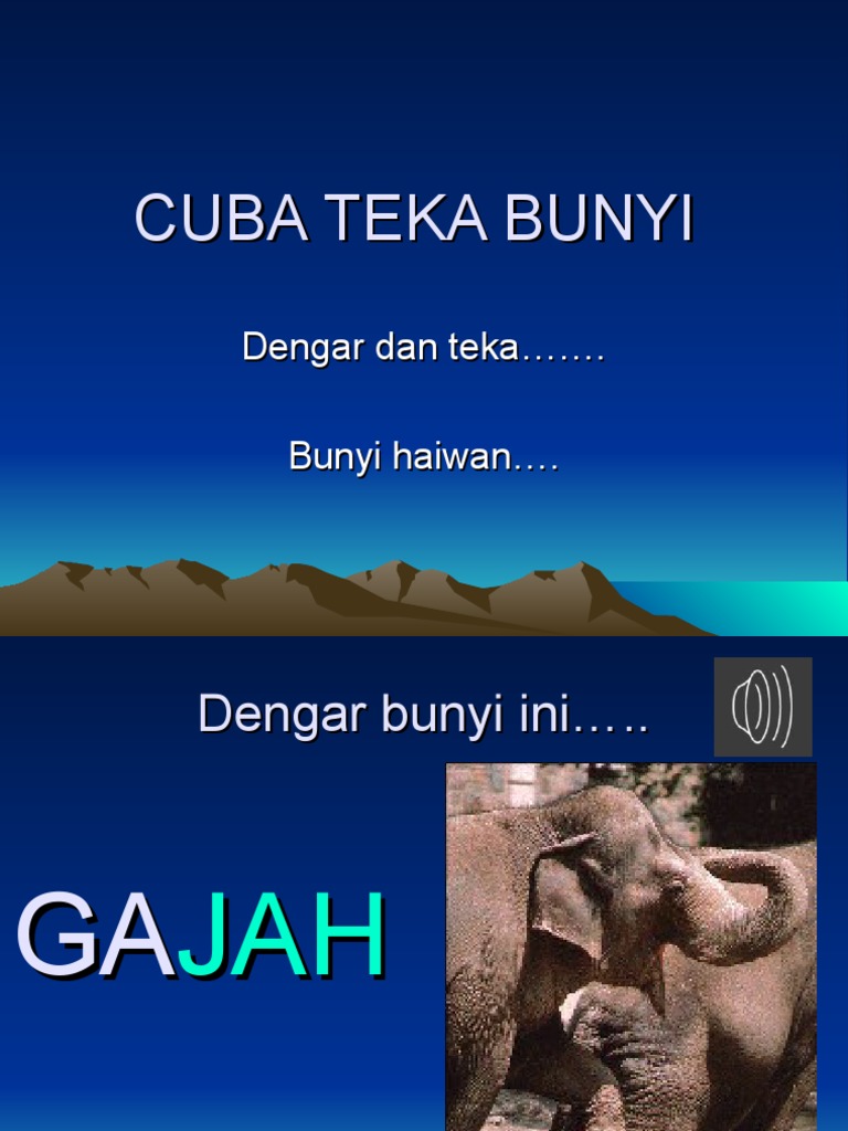 Bunyi haiwan gajah. Kanak-kanak bergerak dan duduk di tempat yang disuruh guru. Berikut ialah senarai perkataan yang digunakan dalam kosa kata bahasa Melayu untuk menggambarkan bunyi-bunyi teriakan yang dihasilkan oleh pelbagai jenis haiwan. Kanak-kanak melihat dan mendengar bunyi-bunyi haiwan yang ditunjukkan oleh guru.